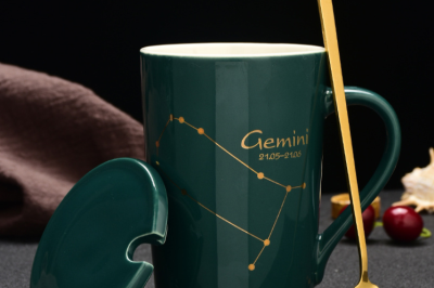 Taza de cerámica de porcelana con tapa y cuchara